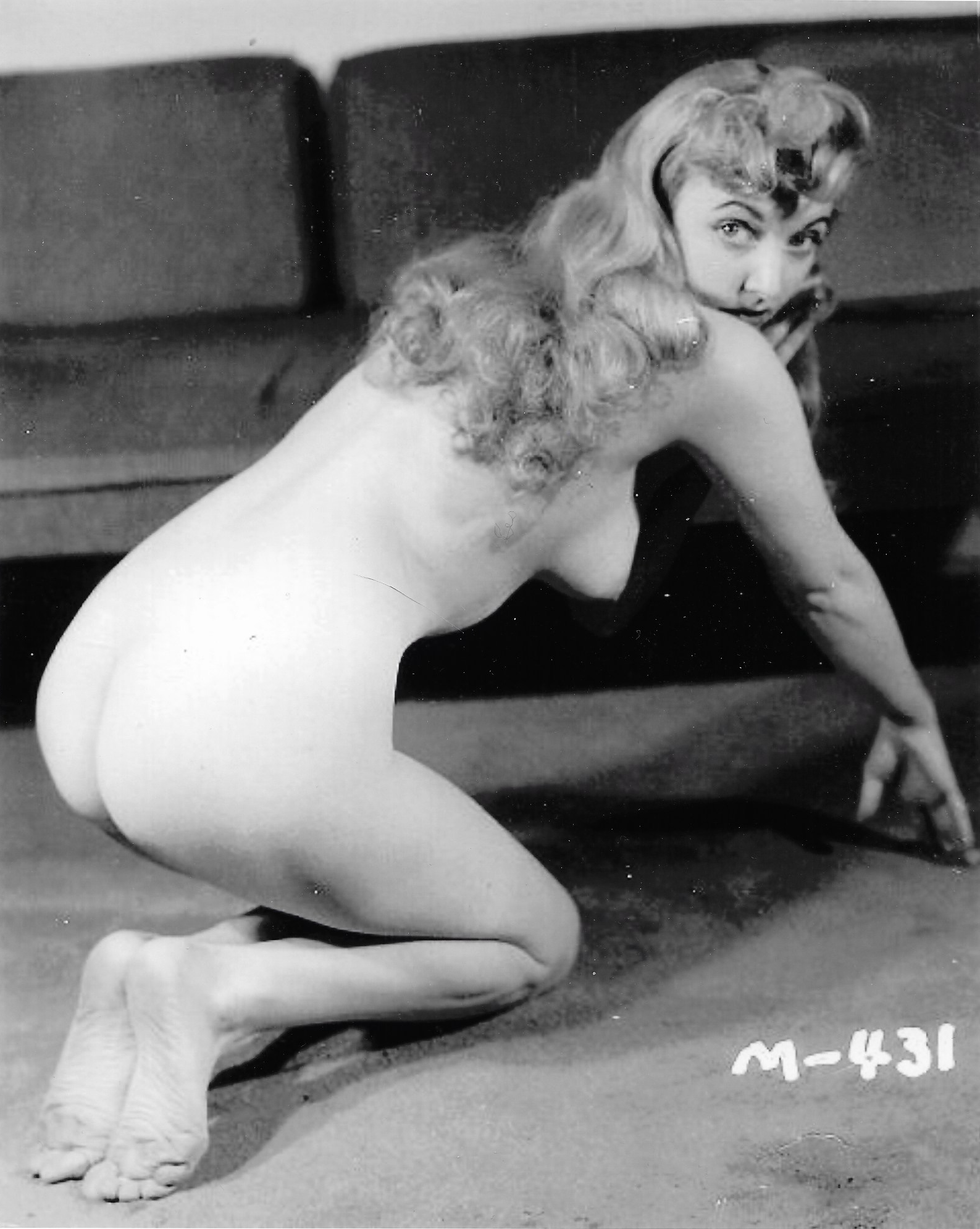 This reminds me so much of what could be a Bewitched episode. This woman was one of Darrin’s clients. She started showing too much of an interest in Darrin, and Endora or Serena stepped in. What they turned her into is hard to say. But she was on all fours and they didn’t bother to dematerialize her clothes. Now, she’s herself again, but wondering why she’s stark naked on this couch. Anyone have any ideas?